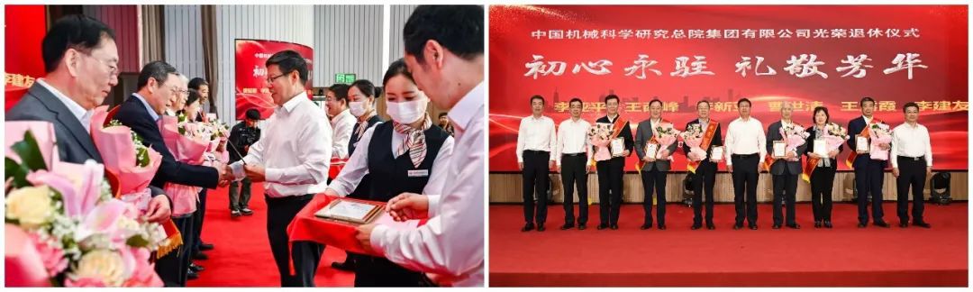 仪式上,研究生为荣退同志献上鲜花,集团领导颁发纪念册,象征着对荣退同志的深深敬意和美好祝福。