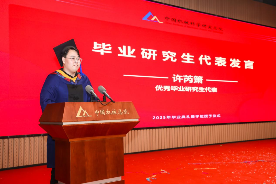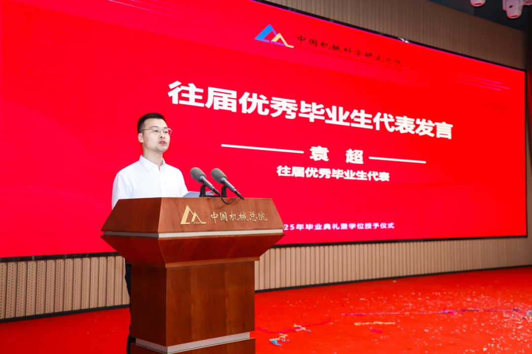 往届优秀毕业生代表袁超分享留院工作以来的科研经历与成长,鼓励学弟学妹们“以‘敢为人先’为刃,在工业母机、工业软件的赛道上破浪前行;以‘开拓创新’为炬,为中国制造业的高质量发展点燃燎原星火。”
